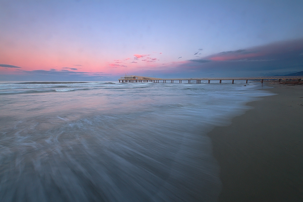 Il mare che entra entra nella fotocamera e da lì negli occhi di chi osserva è oramai un tuo marchio di fabbrica. Il primo piano del movimento dell'onda è comunque congeniale a condurre l'osservatore verso il pontile e poi ai delicati colori del cielo. Ben composta, senza inutili fronzoli, essenziale nelle linee e nei colori.