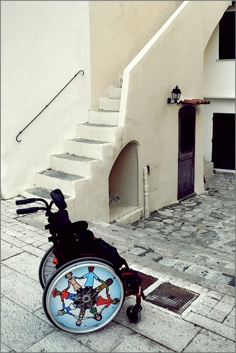 E qui si avverte, così come si avverte il dramma di un bambino con problemi particolarmente gravi (il supporto per la testa ...) ed il problema delle barriere aschitettonice, come è tale quella scala bianca che in altro contesto non potremmo che ammirare per la purezza del disegno, senza pensare che il corrimano che si interrompe la rende poco sicura anche per chi è semplicemente anziano.
