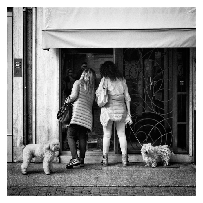 Questa scenetta si è ripetuta davanti ai miei occhi per tre volte. Le padrone intente a guardare le vetrine, mentre i cani non sembravano avere lo stesso interesse e questo mi ha spinto allo scatto. Tutti i dettagli/assonanze che mi avete fatto notare sono solo un colpo di fortuna.