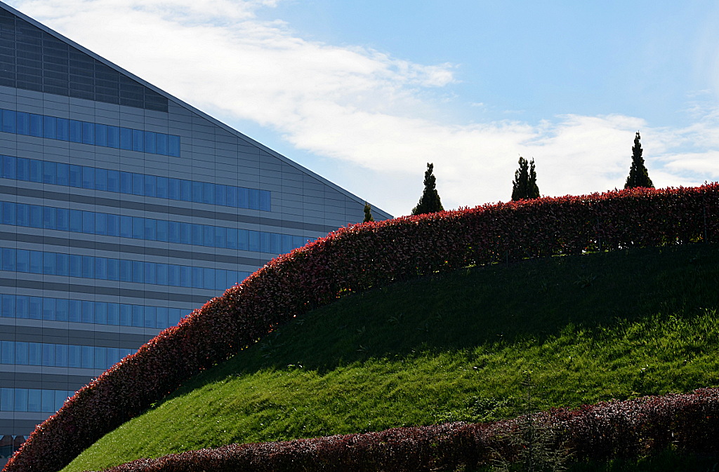 Milano, scorcio dal Parco della zona ex-Portello con sullo sfondo edifici industriali moderni.