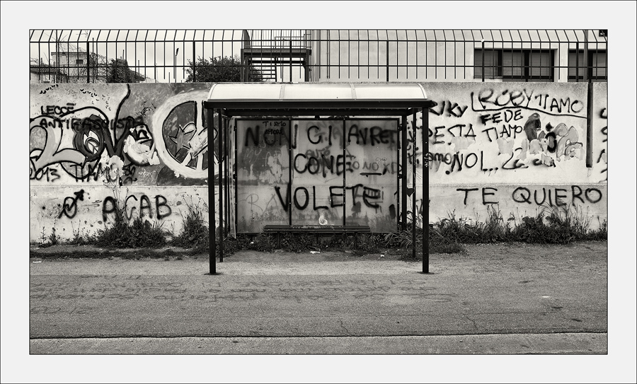 Una rigorosa composizione in contrasto con le anticonformiste "grida" delle scritte.Ottima rappresentazione di scorcio urbano che "parla" anche in assenza di persone.Bello,come sempre,il bn.Complimenti e saluti,Sergio.