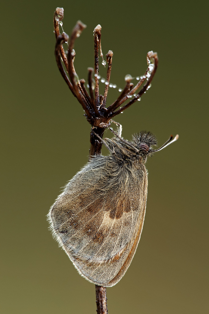 Pioggia, poco sole, colori sobri e pacati..., un posatoio spoglio ed una infreddolita Coenonympha.