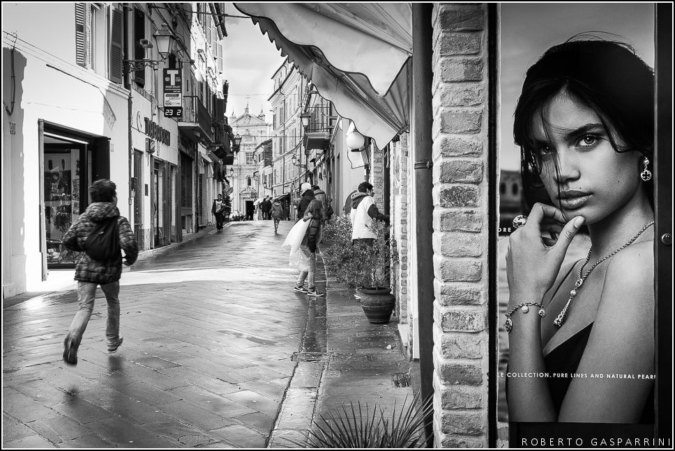 Secondo me l'occhio viene attirato dal manifesto (il cui scopo è proprio quello) e tutto il resto passa piuttosto inosservato. Insomma, lo sguardo accattivante della modella interagisce con il fotografo/osservatore, ma senza un legame con il resto della scena.