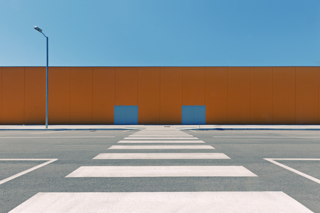 Mi piacciono i colori complementari e lo sguardo che viene portato dalle strisce pedonali fino a quella che potrebbe essere una porta (in senso calcistico) o un bersaglio.