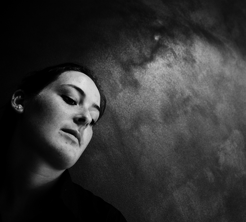 Bello il disegno di luci e ombre sul viso, bella l'espressione malinconicamente assorta, ottimo il segno grafico dello sfondo. Bellissimo ritratto. Complimenti Ale.