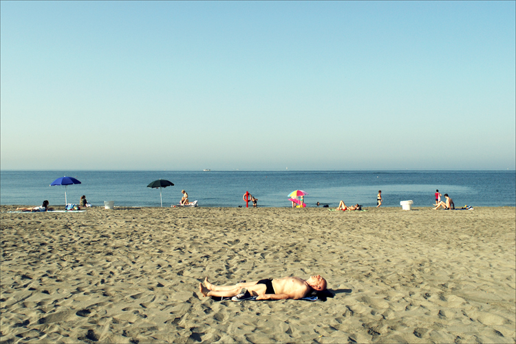 Interessante immagine sviluppata su linee orizzontali,dall'uomo disteso alla rada fila di timidi bagnanti fino al lontano orizzonte.Bella ed equilibrata composizione e gradevole il colore.Complimenti!  |