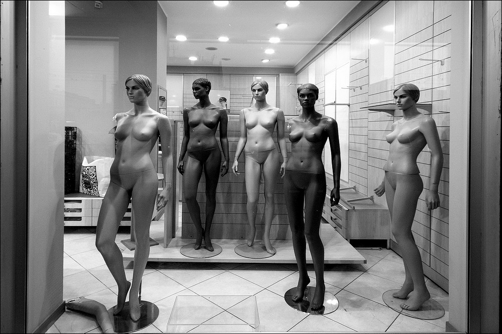 In B/N l'alternanza dei toni di grigio dei manichini dà ritmo all'immagine.