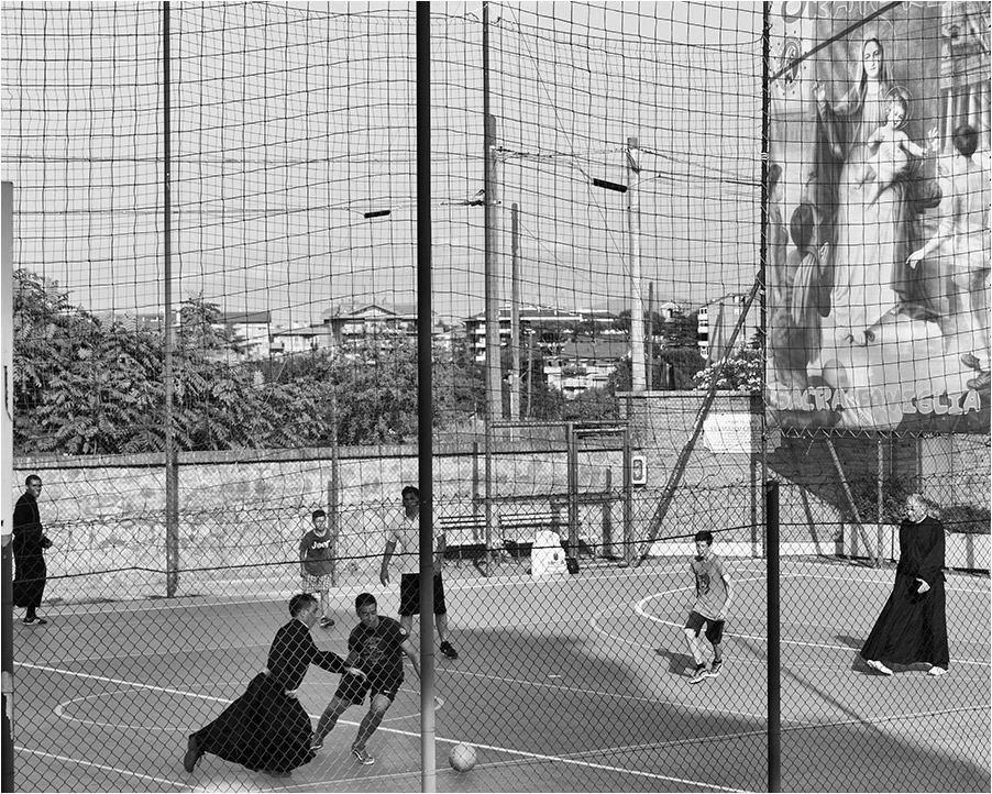 Il fulcro dello scatto, l'azione di gioco, è valorizzato dalla posizione dinamica e dall'abito svolazzante del giovane sacerdote. Il contenuto narrativo è significativo. La composizione appare a mio avviso un po' forzata dalla necessità di includere per intero il drappo con l'immagine sacra e dalla brusca (anche se sapiente) chiusura a sx. La presenza della rete aiuta comunque a riempire la parte in alto con l'eccesso di cielo. Che poi, a pensarci bene, visto il contesto, l'eccesso di cielo ci può anche stare Wink