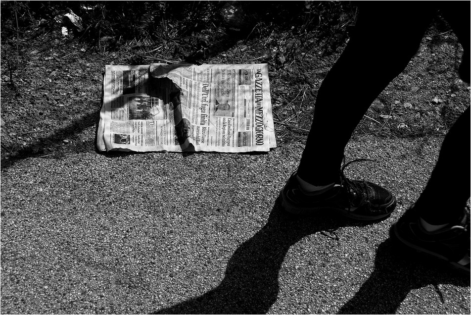 Detto questo, la composizione mi piace. Tuttavia, non comprendo la presenza delle gambe della passante. Nulla aggiungono al racconto. Forse, da un punto di vista di compensazione dei toni, fanno da contraltare al bianco del giornale ma, risultano, d'altro canto, troppo esuberanti nell'economia dell'immagine.