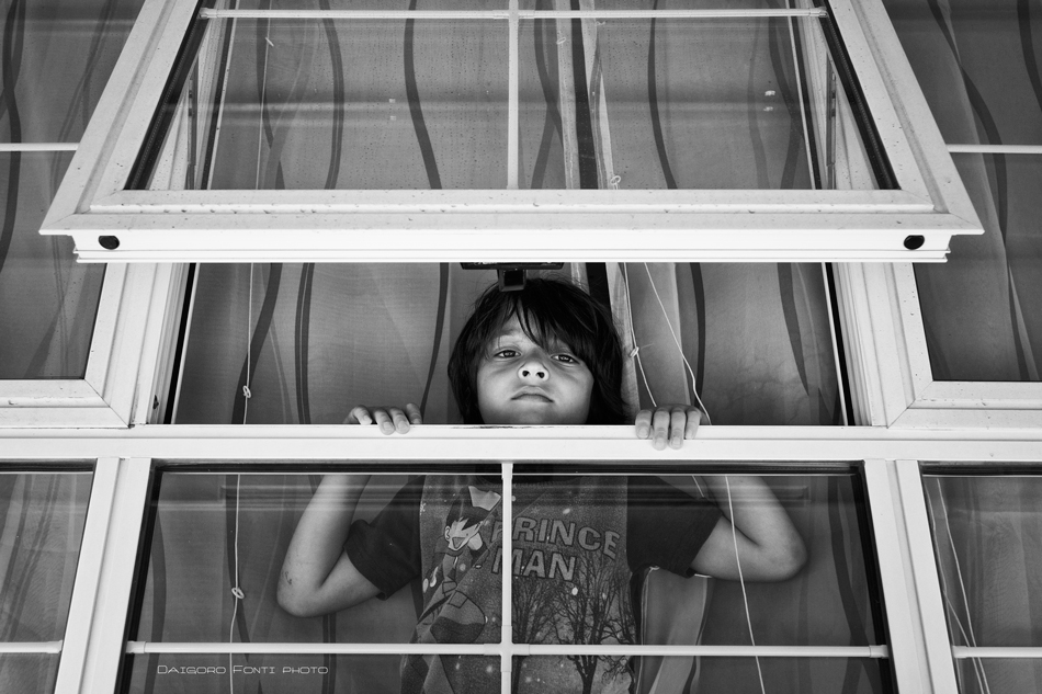 Complimenti, bellissima, senza tempo. Ottimo il BN. Con il nero che trova il suo picco di lucentezza negli occhi del bambino.sguardo adulto in contrasto con la maglietta. Le assicelle della finestra segmentano in modo equilibrato il fotogramma e quindi efficCe risulta l'irrompere di questo bel volto enigmatico.