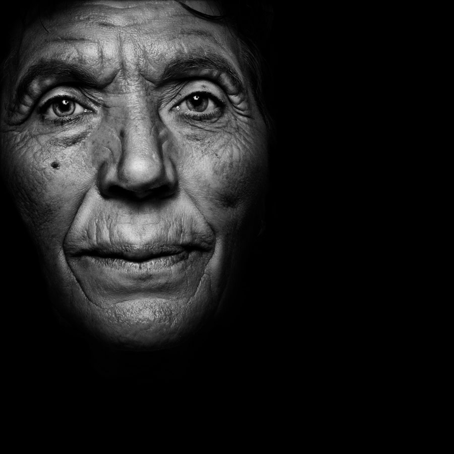 Un buio avvolgente accentua ancor più questi lineamenti come scolpiti, segno dopo segno, di un volto speciale.
