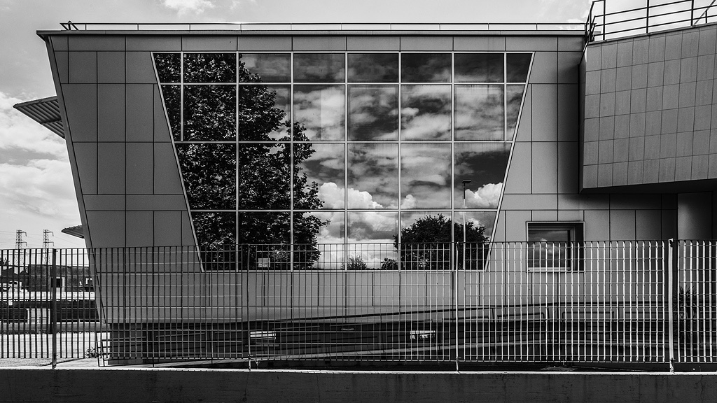 mi piace il b/n ed il riflesso..ma mi sarei concentrato su di esso..il muretto in basso e la recinzione..distraggono lo sguardo..