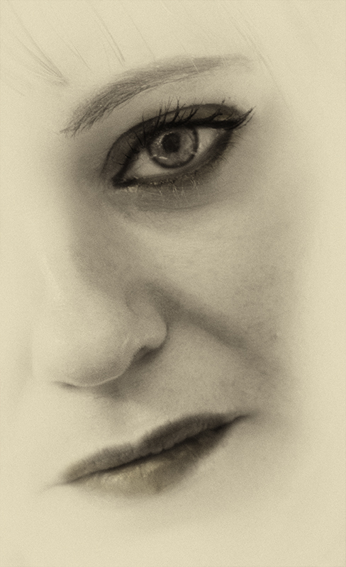 L'occhio sinistro mancante, per me, non deve sembrare cancellato ma solo tagliato fuori dall'inquadratura, stessa cosa per la parte destra ma non potendo ricreare l'incarnato e nemmeno croppare di più perchè sarebbe stato impossibile comporla dentro un 2:3 verticale senza avvicinarsi troppo al sopracciglio e al labbro inferiore mi sono dovuto accontentare del bianco.