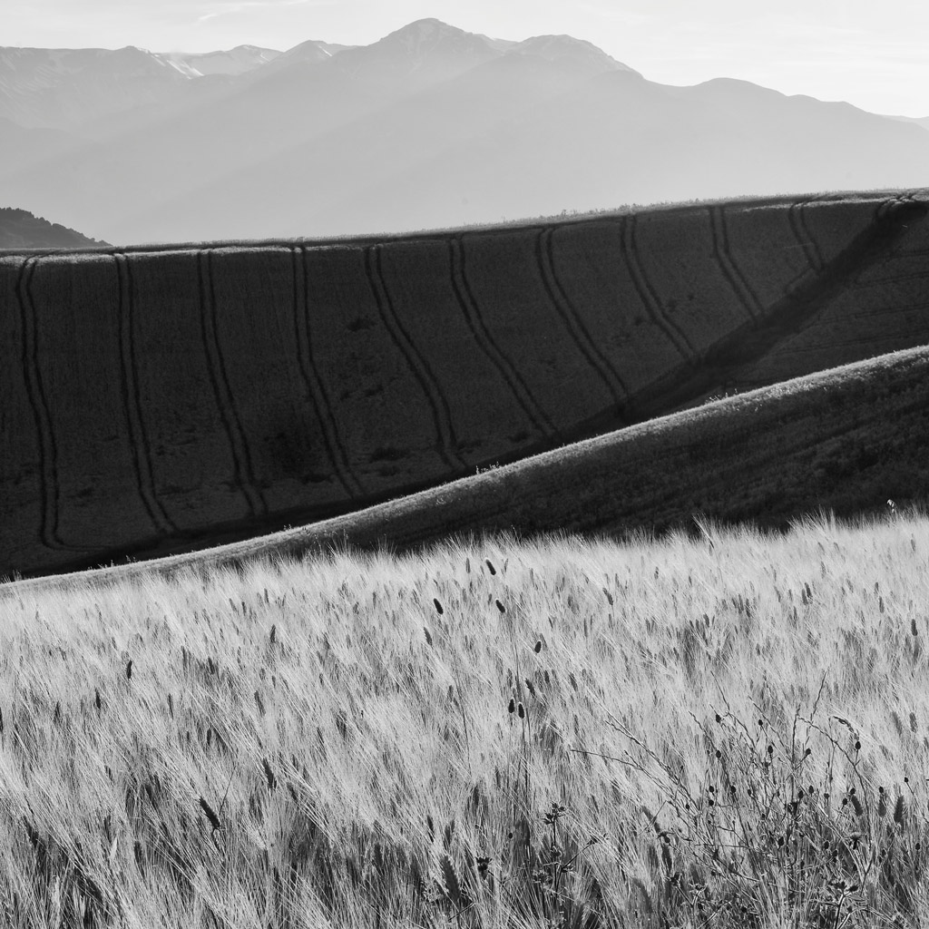 Grande profondità di campo,nonostante l'uso del tele,che ci accompagna dalle vicine spighe alle alte montagne.Ottima la composizione favorita dalla compressione dei piani e bello il bn.Complimenti!! Smile