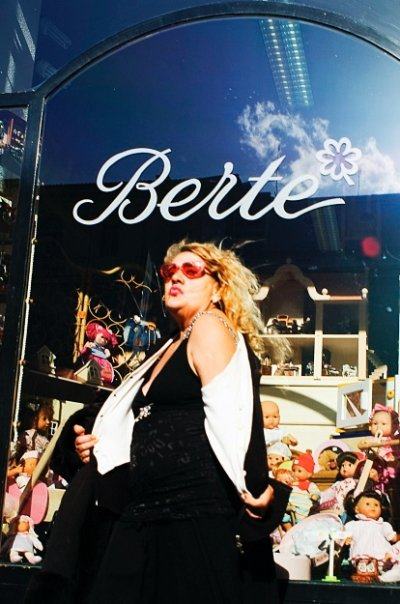 Lei in bianco e nero a parte la testa virata al rosso con labbra, capelli e occhiali che richiamano l'attenzione di chi osserva. Ottimo che ci sia anche l'arco della vetrina a incorniciare.