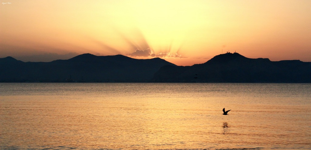 Una bella raggiera di sfumature ricche attorno al sole, che si nasconde dietro le nuvole, nella serenità di un volo, nella larghezza della ripresa in controluce. Noto, anche se non spiacevole, un leggero effetto flou che si nota sopratutto sulle ondine increspate.
