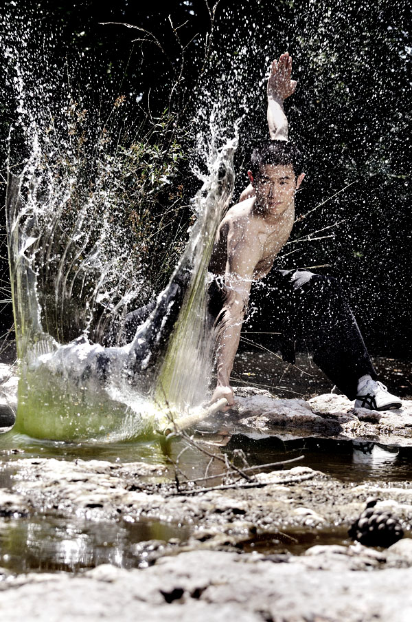 Sembra un praticante di arti marziali che dà una bella "bastonata" ad uno stagno.