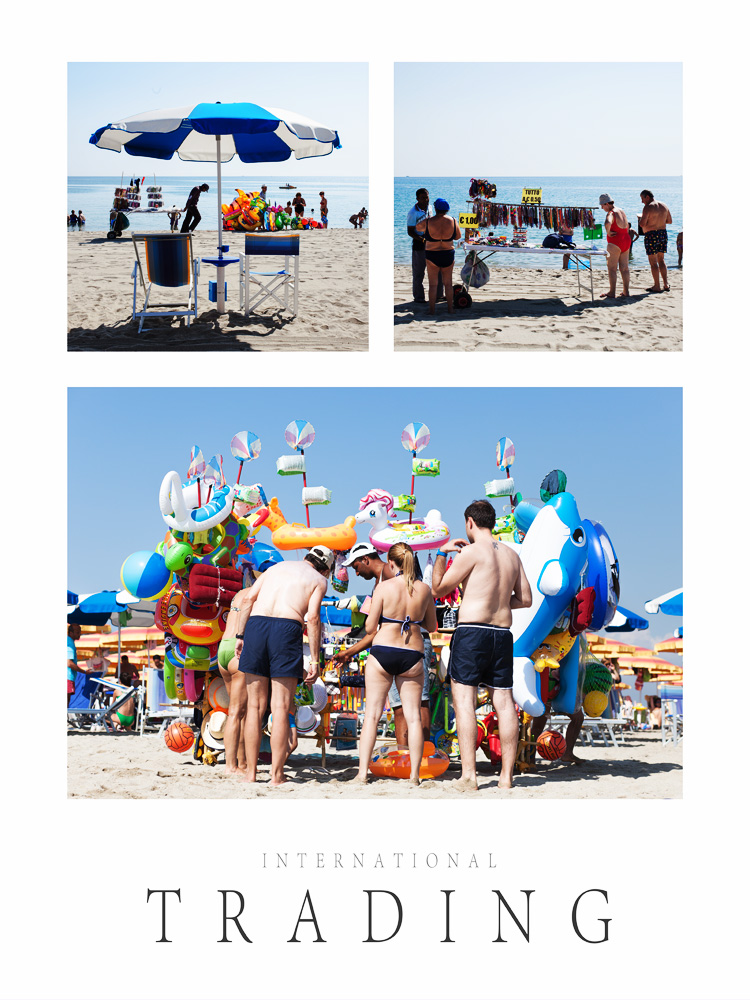 Nella prima si vedono le due sedie vuote a significare che i bagnanti sono andati a fare compere dai vucumprà, nella seconda comincia il commercio e nella terza il commercio va alla grande alla faccia della crisi!