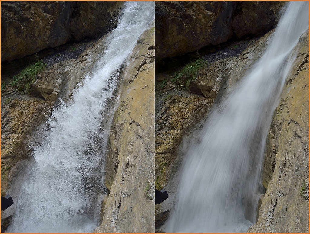 Bello questo dittico sugli effetti dei tempi lunghi sulla cascatella. Mi stavo immaginando anche l'effetto che farebbe miscelare la parte destra della prima immagine con la parte sinistra della seconda (o ancora meglio al parte sopra con la parte sotto) .. un prima e dopo in tempo reale Smile