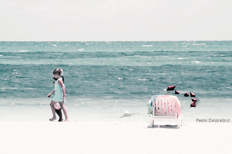 Sulla foto: mi piace il bianco puro alla base che sospende le figure. Sdraio e boe che legano al mare e...forse avrei preferito ancora un bianco in alto. Non lo so. In ogni caso mi sembra una composizione e una conversione ben riuscita.