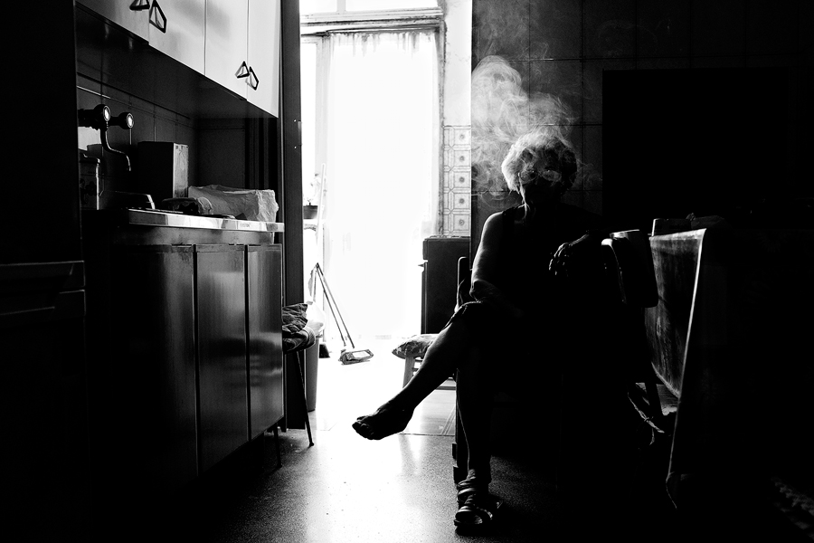 Quante cose raccontate di Anna, nonostante non se ne veda nemmeno il viso...Bellissimo il fumo che si libera quasi con voluttà dalla bocca oscura, un intervallo di piacere strappato alla quotidianità un po' ripetitiva del vivere domestico...la luce appena appena sufficiente a delineare una mano un po' nodosa che parla dell'età di Anna, un braccio conserte e le lenti degli occhiali che comunque danno forma e dimensione al volto sconosciuto...Mi piace molto la gamba accavallata col piede liberato dalla ciabatta ampia e sformata dal valgismo dell'alluce. Bello il punto di ripresa che descrive un angolo angusto della cucina con quella porta luminosa ( forse un po' troppo luminosa, si è persa la materia della tenda), dove le scope appoggiate sembrano attendere il momento di relax che Anna si è concessa. Anche se i neri sono molto chiusi e chiamano molto l'occhio, l'effetto finale è per me molto efficace, bravo  |