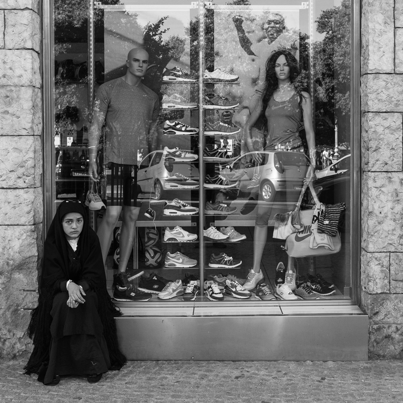 Sicuramente non è una suora ma il personaggio crea un bel contrasto con gli abitanti della vetrina.Simpatico scatto ben composto in ottimo bn.Complimenti! Smile