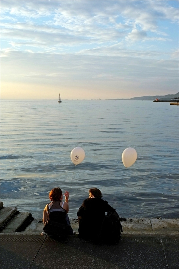 Deliziosa Sergio, una bella scenetta con simpatici soggetti e cromie stupende. Quei palloncini sospesi così come sembra sospeso il tempo a chiacchierare contemplando il mare. Rilassa, intriga e incuriosisce Ok!