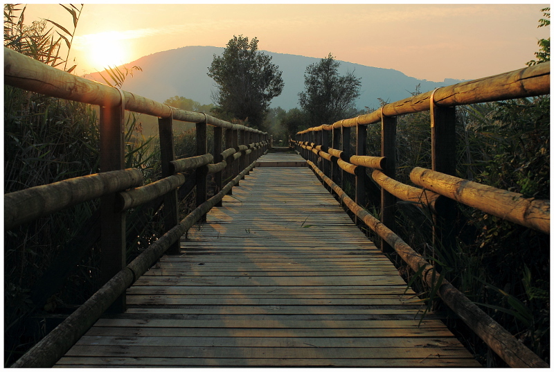 La luce è bella,assume una pregevole tonalita' sul legno illuminato da un lato,la prospettiva creata dal corrimano è forte,per un genere abbastanza presente in rete ,con i vari pontili che vanno verso lo spazio, anche se in questo caso ricorda piu' il sentiero natualistico,non sono un fan delle zone piu' chiare del cielo,qui un filo velata comunque.ciao  |