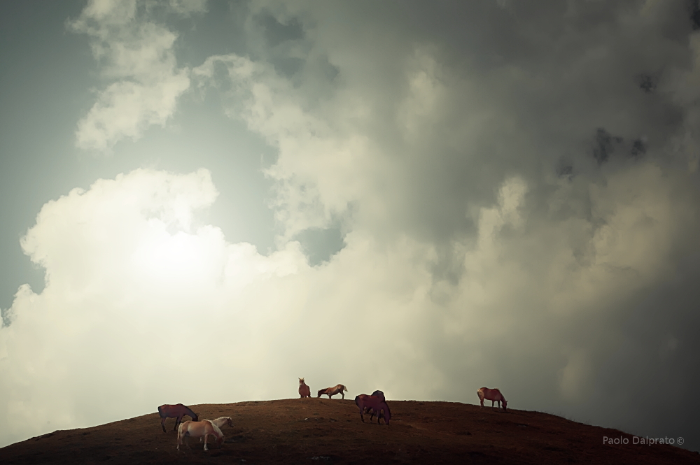 Molto interessante questa composizione minimalista con il profilo della collina a 1/10 del frame. Il pascolare quieto dei cavalli, sotto ad un magnifico cielo, è molto ben descritto.