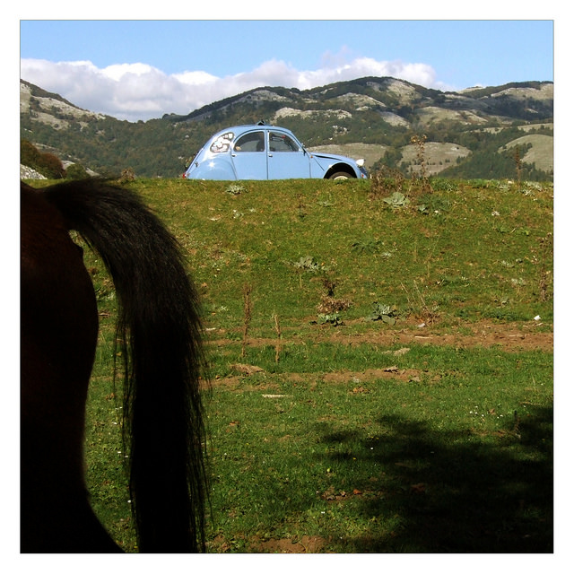 Le forme tondeggianti delle colline sullo sfondo, poi la macchina e infine il cavallo! Simpatica foto e adatto il formato quadrato.
