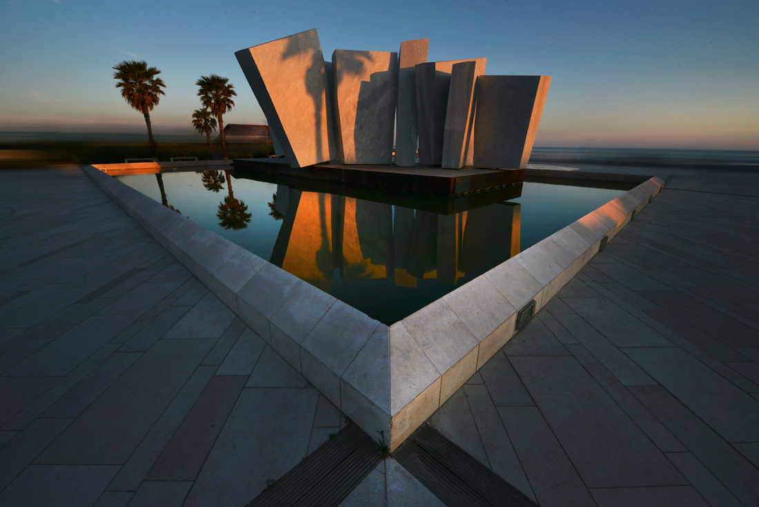 Forse si allontana leggermente dai canoni assoluti della fotografia architettonica pura, non avendo avuto ben sotto controllo linee verticali (ben visibili dalle palme non esattamente in piedi), o dagli angoli dell'immagine in basso che forse si potevano valorizzare con qualche diagonale interna.. ma la linea centrale del basamento in basso e l'asimmetria diventa un tratto interessante del tutto, insieme alla luce calda del sole che accarezza i blocchi di marmo..