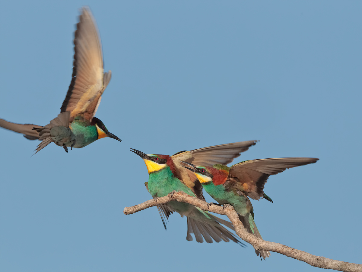 Personalmente il taglio dell'ala non da minimamente fastidio perchè il Gruccione in volo sta entrando in scena e il suo arrivo ha scatenato il naturale senso di territorialità negli altri due!