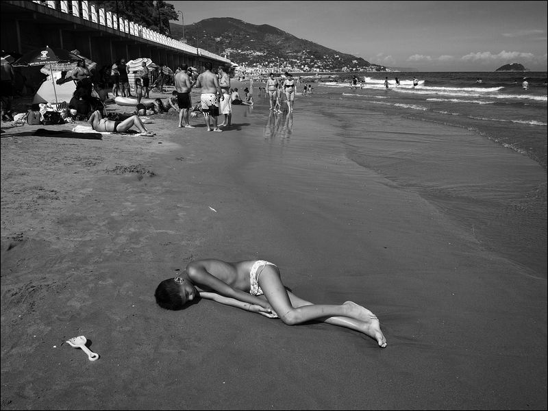 Il tuo grande occhio ci propone ancora una particolarissima visione balneare dove,come nella precedente della signora,il soggetto principale si è abbandonato alla sabbia ed al sole.Qui però la suggestione è maggiore con un filo d'inquietudine.Difficile vedere in spiaggia un ragazzino fermo e specie in questa posizione che fa pensare che addirittura stia dormendo.Quella paletta vicina ci porta ad un gioco interrotto.Quando si risveglierà,tra un minuto,forse non lo interesserà più e si troverà proiettato in una nuova età della sua vita.Ottimo il bn e grande la profondità che spazia fino al lontano isolotto.Complimenti grandissimi!! Smile