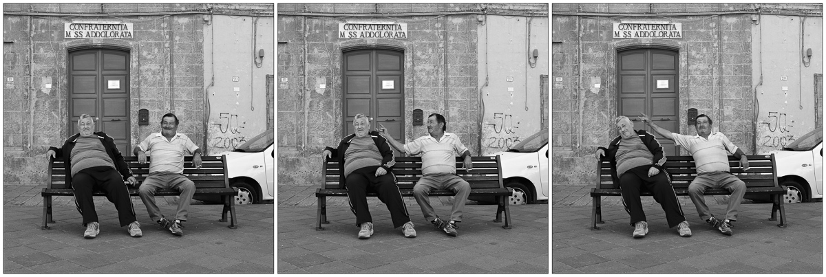 Simpatica sequenza dove è evidente l'interazione tra fotografo e soggetti.Nel vedere la macchina puntata l'uomo più giovane ha tentato di mettere in atto il classico gesto goliardico che accompagnava tante foto di gruppo,ma l'altro,pur sonnacchioso, si è reso conto e si è sottratto in extremis.Divertente e ben fatta!  |