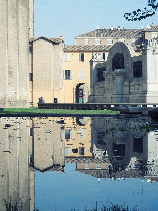 Una luce particolare e le abbondanti piogge che avevano riempito le basse vasche del Piazzale della Pace (Parma, vicino alla Pilotta) hanno creato le condizioni di questo scatto.
