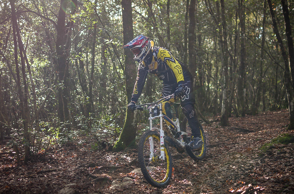 Il tratto che hai fotografato è un segmento di riposo, si vede che il rider è composto ma in posizione rilassata, quindi sicuramente in un altro momento sarebbe stato ben carico sulla bici. E' inoltre utile in questi casi, quando fotografi di lato, rallentare un po' i tempi e provare qualche panning, che però in DH è sempre difficile realizzare bene.
