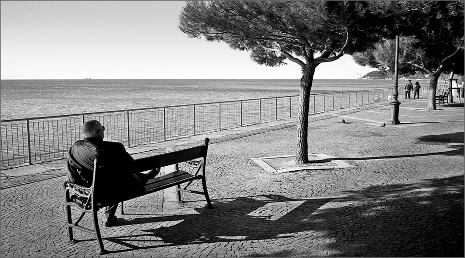 Mi piace molto la diagonale che hai creato nello scatto, l'anziano sulla panchina proietta tutto se stesso verso una sola direzione compresa la sua gamba destra, quasi cercando una posizione ottimale per entrare a rivisitare il suo passato