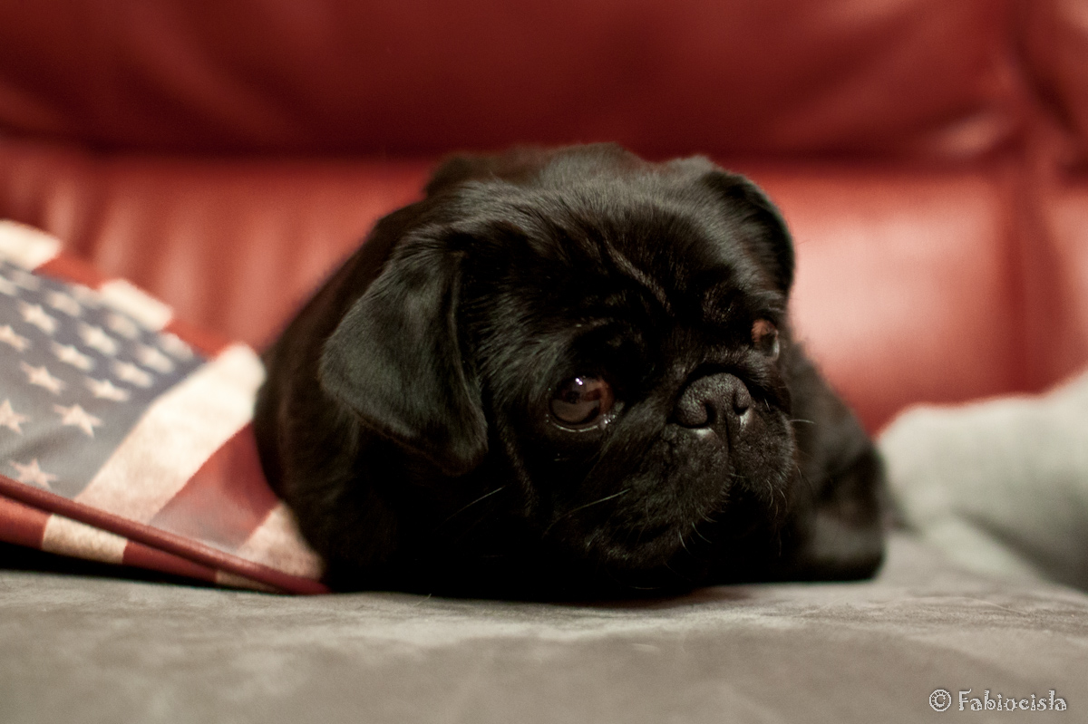 Il cuscino sulla sinistra è di troppo nella composizione in base ai miei gusti. Bella invece l'espressione imbronciata tipica dei molossi unita all'occhio languido ed al tempo stesso sornione. Bello anche il contrasto fra lo sfondo rosso ed il primo piano che ben si sposano per i colori. Insomma stringerei un pochino con l'inquadratura sul simpatico protagonista.