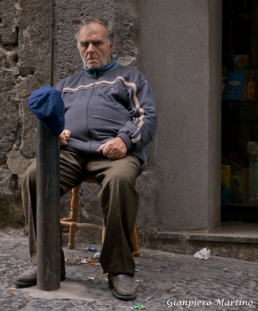Io ho invece una mia lettura di questo scatto:l'uomo non ha una espressione"persa"lo sguardo è vigile ed è puntato in macchina,si stava accendendo la sigaretta quando ti ha notato ed è rimasto per un attimo perplesso.Il cappello è poggiato lì per comodità ed indica anche un segno quasi di possesso di quell'angolo di strada per lui sosta abituale in attesa che qualcuno entri nel suo negozio che probabilmente non va alla grande visto il numero di cicche presenti.In questa ottica,forse solo frutto della mia fantasia,lo scatto mi piace! Ok!