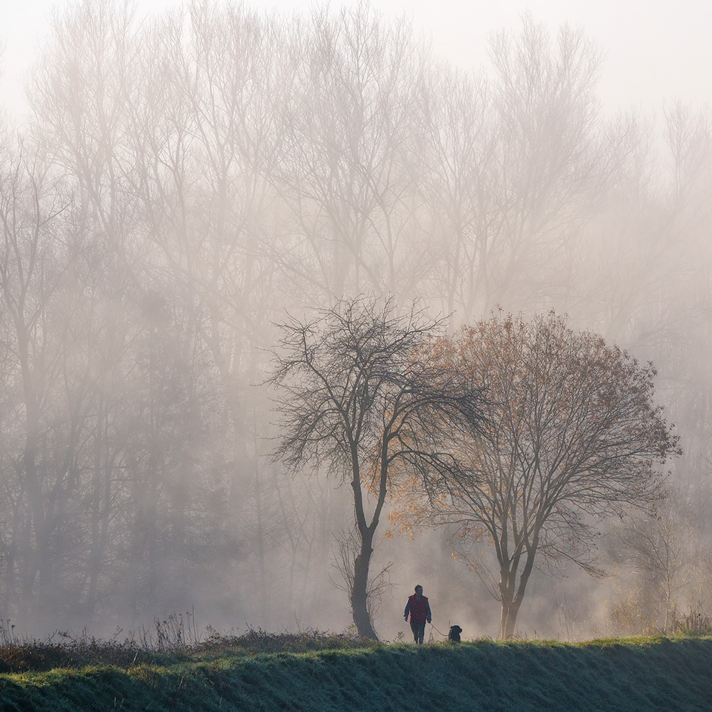 Lo sfondo riempito d'alberi cattura l'attenzione e divide il protagonismo con i soggetti in primo piano; ottima la luce mattutina che si posa delicatamente su alberi ed argine