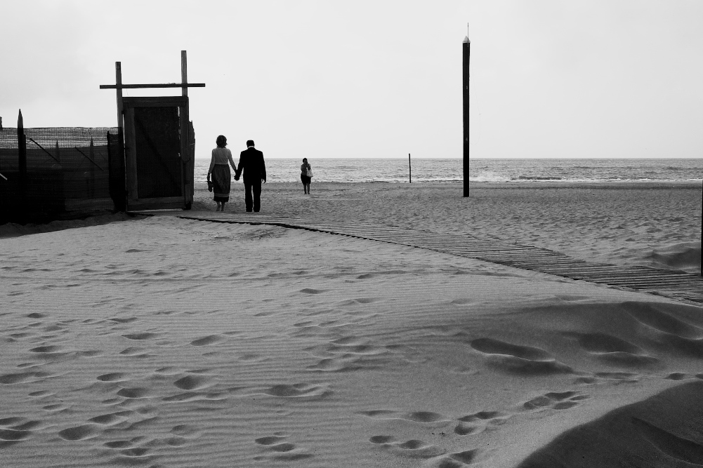 Se noti, circa una metà della stessa è riempita dalla sabbia in primo piano, che è solcata da parecchie orme umane; l'occhio spazia sulla grande superficie sabbiosa e cerca istintivamente una successione di orme che conduca verso la coppia umana (il "cammino" di orme può essere un forte "racconto" fotografico) o eventuali altri elementi d'interesse espressivo o compositivo che giustifichino una tale "invadenza" dell'elemento sabbia.