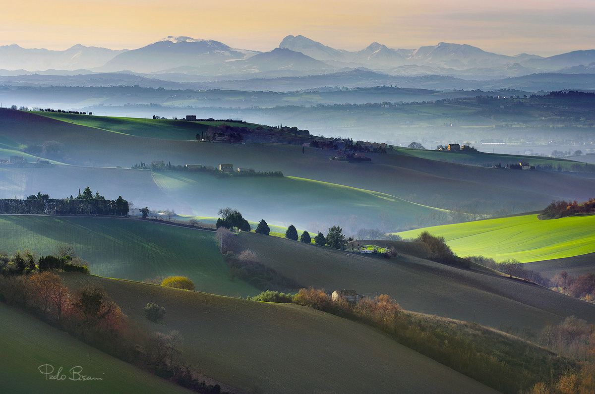 luce stupenda per questo paesaggio dolce nei toni e nelle curve delle colline che ci spingono con lo sguardo fino alle montagne
