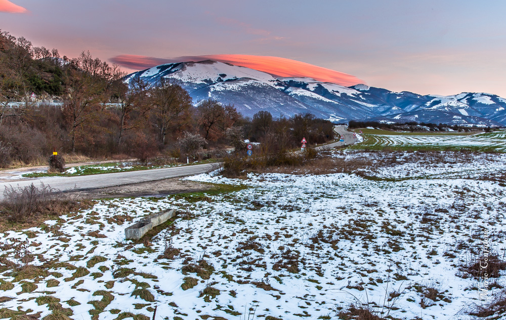 Questa deve essere la famosa nuvola lenticolare che ha caratterizzato il centro Italia qualche settimana fa. Bel paesaggio ma, per riprodurre sulla fotografia il suo fascino, avrei evitato la strada asfaltata