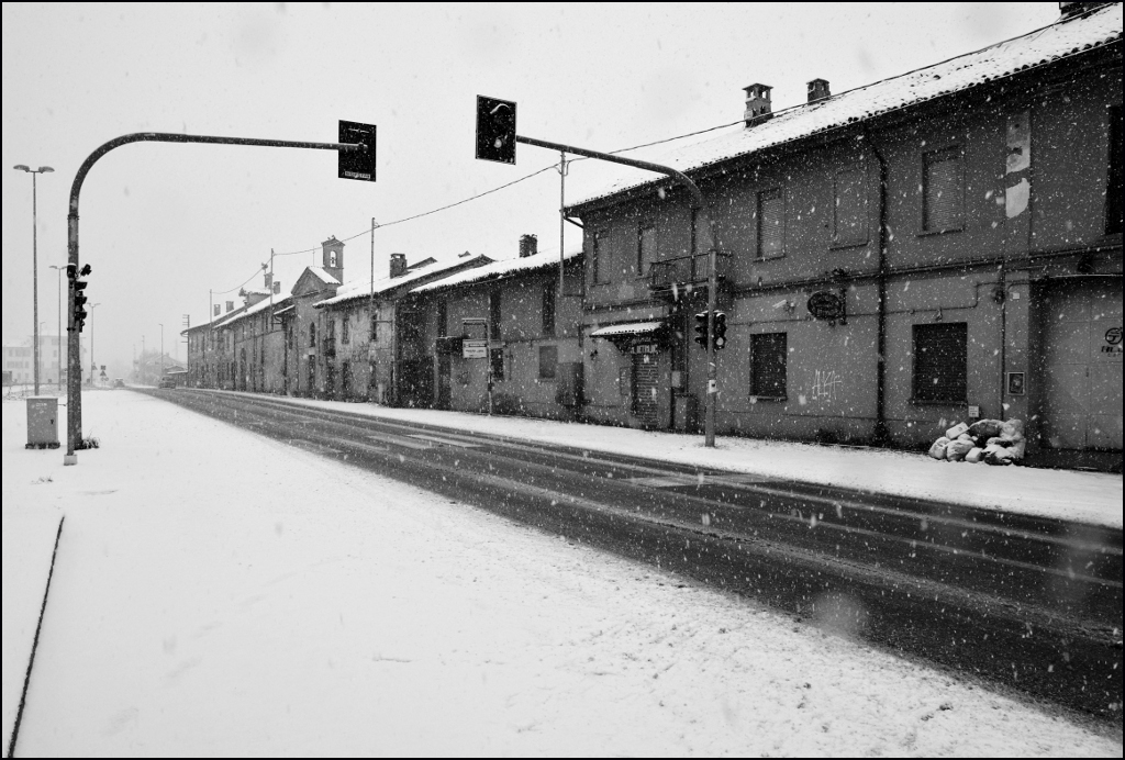 Una bella immagine, con i semafori a fare da quinta ad uno scenario che pare quasi senza riferimenti temporali. Eliminando qualcosa a destra, secondo me, la "cornice" funziona meglio.