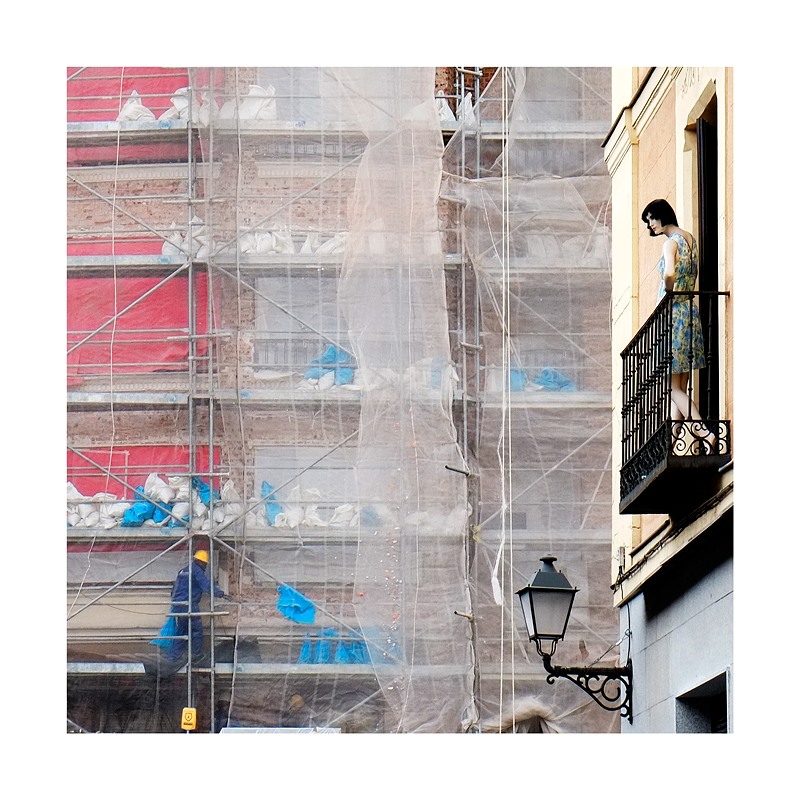 Una interessante coesistenza fra varie umanità. Il manichino al balcone sembra quasi umana... mentre l'operaio al lavoro sulle impalcature assomiglia con il casco giallo ad un omino della Playmobil!