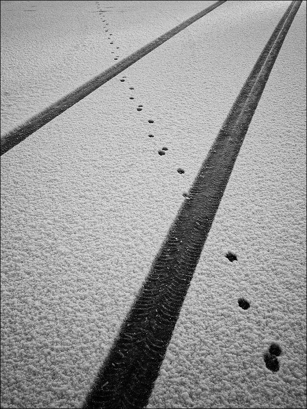 Concordo con i commenti precedente: ottima dal punto di vista grafico, come pure per l'accostamento trovato tra quelle orme naturali e le nostre innaturali tracce... umane.