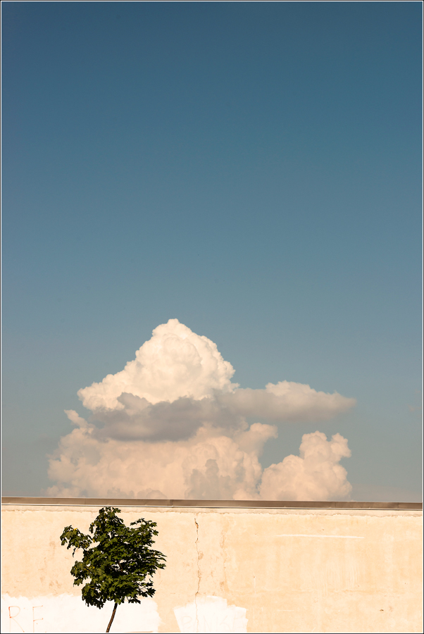 La pendenza della linea del muro è data dal punto di scatto. Quando posso e se cerco possibili precisioni nello scatto e forse avrei reso orizzontale il confine, ma si tratta di una scelta possibile , e in questo caso non certo di un errore. Per il resto la proposta mi piace molto: trovo delicato e potente insieme questo accostamento di pochi ma essenziali elementi, il cielo alto, e soprattutto il morbido dominio di una nuvola sul tutto, oltre e a dispetto del confine murale.