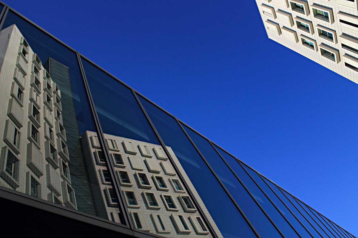 Bellissimo punto di ripresa con la diagonale che fa dialogare l'edificio reale con il suo riflesso. Complimenti Ok!