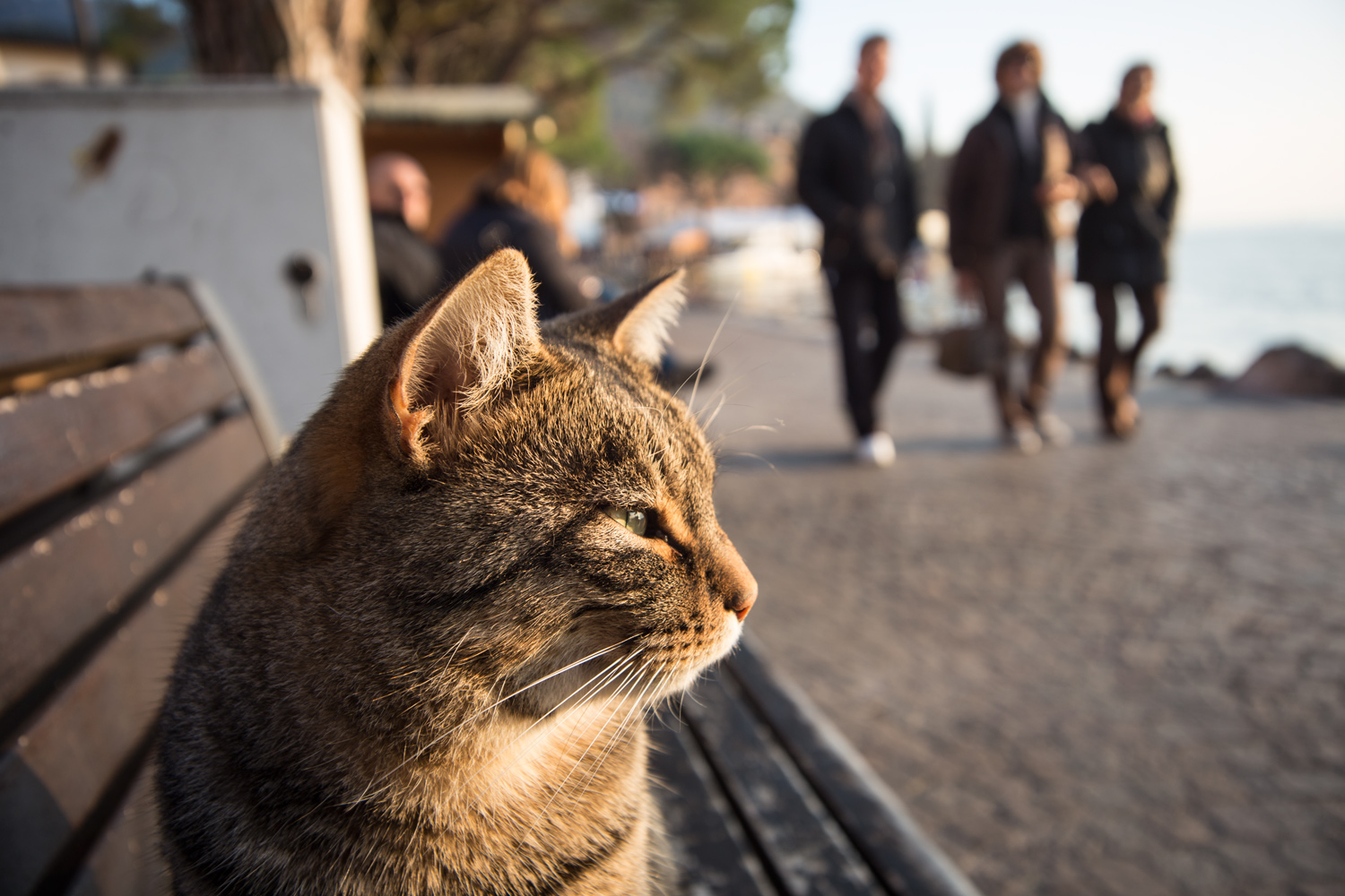 Bella, il gatto sembra assorto nei suoi pensieri con lo sguardo perso verso l'orizzonte, assolutamente incurante dei passanti che arrivano.
