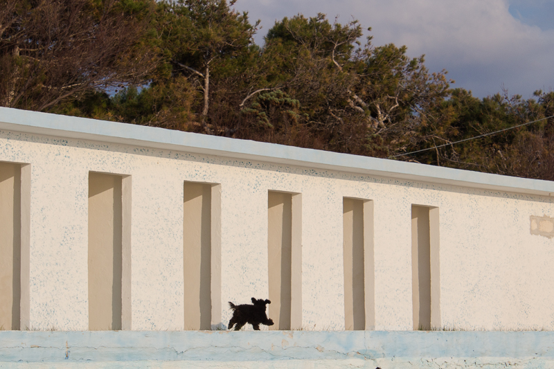 Simpatico il momento colto,bello lo stacco del cane scuro sul muro candido. Ok!